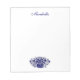 A custom notepad with elegant script letters and vintage woodcut art of a basket of daisies and other flowers in blue and white.