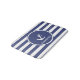 This blue and white bath mat has horizontal stripes. In the centre, there is a white ship's anchor and a place to enter the recipient's name.