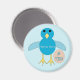 This fun magnet features a cute cartoon of a blue chick. The chick has a pale blue belly and darker blue wings and head with a yellow beak and feet. Next to the chick is a small egg.