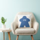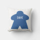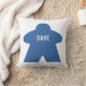This meeple pillow can be personalised with a name in white font. On one side, there is a large blue meeple with the custom text. On the other side, there is a pattern of small blue meeple to complement the other side. Both sides have a white background.