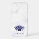 An iPhone case with elegant script letters and vintage woodcut art of a basket of flowers in blue and white on a rustic faux canvas background.