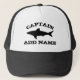 Custom name boat captain hat with shark logo. Vintage typography template for sailor, fisher or skipper. Make your own personalised cap for fishing, sailing or boating. Black and white symbol with grungy text. Cool masculine Birthday or nautical Fathers Day gift idea for men. Make your own for dad, uncle, father, brother, husband, grandpa etc. Custom headwear for summer. Ocean animal silhouette.
