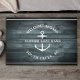 Nautical anchor boating doormat on printed dark driftwood reading "welcome aboard" as well as your custom boat name and location.