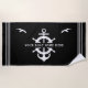 Nautical boating beach towel reading your custom boat name surrounded by a ship's well and anchor in modern black and white with seagulls.