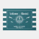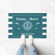 Welcome aboard! Nautical boating doormat reading your custom boat name surrounded by a compass with an anchor on modern teal stripes with seagulls as well as a second line of text ready to be personalised.