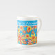 Bone China Mug to personalise, with an all-over pattern of red, orange, yellow flowers on a bright turquoise background; from a handpainted paper collage by Judy Adamson.