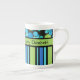 A chic Bone China Coffee Mug to personalise, with a quirky 'Blue Moons' pattern in bright blues and neon green on a black background, teamed with a coordinating deckchair-striped pattern. Part of the Posh & Painterly 'Blue Moons' collection; from a handpainted paper collage design by Judy Adamson.