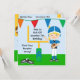 Get ready for game day! These colourful customised football theme birthday invitations are great for boys who love football or are having a football birthday party celebration! Features flags, football field, football, football shoes, and a boy in a blue football helmet and jersey holding a football! Easy to customise with your child's birthday party specifics!