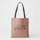A chic modern clay coloured bag with black script name and red heart that's perfect for a bridesmaid proposal. Your bridesmaids can fill their tote with essentials for Bachelorette Party trips, or for essentials to bring on the morning of the wedding.