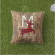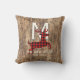 Custom outdoor patio throw pillow with red and black Buffalo Lumberjack clan checkers plaid tartan pattern deer with antlers silhouette image on a contemporary woodgrain textured background. With room to customise or personalise with family name monogram of your choice.