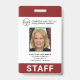 Corporate photo ID badge in a vertical layout. This simple yet professional design features a red /burgundy border on the top and bottom with white in the middle. The template is personalised with your logo, company name, employee name, title, department / location and employee ID. The bottom border has "STAFF" in large bold letters and may be changed to any title desired. The backside has your contact information and instructions for returning if found. This classic design works great for any type of business.