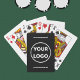 Give your customers fun branded swag featuring your company logo and website or slogan to increase your business marketing reach. Your logo appears on a black background in the centre with your text in white above and below it. The top text is upside down so it can be read when the playing cards are rotated. Replace the sample logo and text with your own in the sidebar. This design will work best with logos which look good on a dark background.