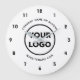 Replace the sample company logo and text with your own in the sidebar to create a stylish minimal wall clock for your business with a simple white background. Your logo can be in color or black and white. Bold black numbers around the edge make it easy to tell the time. Your text curves around the top and bottom of your logo. Click to customize further if you need to adjust the size of your logo with the scale buttons or to change the text color.