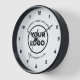 Replace the sample company logo and text with your own in the sidebar to create a stylish minimal wall clock for your business with a simple white background and a black rim. Your logo can be in colour or black and white. Bold black numbers around the edge make it easy to tell the time. Your text curves around the top and bottom of your logo. Click to customise further if you need to adjust the size of your logo with the scale buttons or to change the text colour.