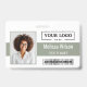 This modern horizontal badge design features a dynamic split layout, perfectly balancing a large employee photo on the left with essential information on the right. The clean lines incorporate a soothing sage green accent bar for the name and title, while prominently featuring your company logo above. This style includes dedicated space for a bar code or QR code, making it a smart, professional choice for identification and access control.