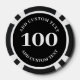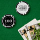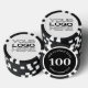 Personalised poker game chips with a custom business logo and your own text. This design in black includes the number 100 but it can be edited with any value amount.