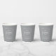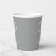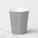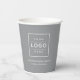 Custom branded paper cups feature your professional business logo design along with custom text that can be personalised with the name of the company, location, slogan, website, or other info. Grey background and white text colours can be modified. Design appears on the front and back of the cup.