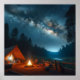 A cosy campsite under a star-studded sky in the wilderness, with the Milky Way clearly visible.