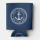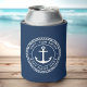 Can cooler featuring a white, elegant anchor and rope emblem with your custom name and boat name on a dark blue background.