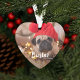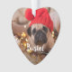 Customise this sweet heart-shaped ornament with two treasured photos of your furry friend. Your custom captions appear on the front and back in white hand lettered style brush typography. Shown with pet's name and the year.
