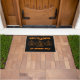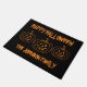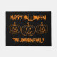 Custom carved pumpkin head Halloween door mat. Fun doormats with personalised family name / surname for this Holiday. Fun party supplies, accessories and decorations with your own funny quote or saying. Make your own custom entry rug for trick or treat night. Add your own welcome message, family name, monogram, surname or quotation. Cute home decor gift idea for the house of office. Personalizable jack o lantern doormat sign template. Create your own jackolantern print entry mat / rug for front door / entryway or hall / party venue, porch, garden etc. Customisable outdoor home decor / decorations for your house or business office, shop, store etc. Available in small and big large size. Pumpkin face carvings with scary typograpghy font in black and orange colour. Happy Halloween!