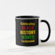 Motivational BLACK HISTORY MONTH CENTENNIAL Souvenir Mug, showing black raised fist graphic against a rich yellow background on the left, and CELEBRATING BLACK HISTORY MONTH CENTENNIAL in bold red, yellow, green typography set against a rich black background on the right. At the middle there is CUSTOMIZABLE text which currently reads THANK YOU DR CARTER G WOODSON (the Father of BHM) which you can personalize with your own wording. A great souvenir to celebrate the Black History Month season—especially during this landmark centenary year. Other varieties of BHM cards, invitations, clothing and decor are available.