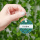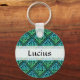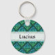 A round key chain of a blue-green Celtic knot repeated diamond tile design against a black background with customisable name in the middle.