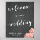 Custom chalkboard wedding reception sign print with pink flowers and customisable text - you can add bride's and groom's name and wedding date. Dimensions of the sign print (poster) are 11 inches by 14 inches.