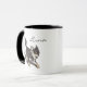A charming hand-drawn illustration of a long-haired black and tan Chihuahua on a sleek white mug with a black rim and handle. The perfect personalised gift for any Chihuahua lover, allowing you to add their favourite pet's name to the top right. This custom Chihuahua mug is an ideal choice for a thoughtful dog mum gift or a unique addition to your own collection. Featuring a simple, elegant art style, it brings daily joy to any dog owner. Make their morning coffee extra special with this one-of-a-kind, customisable keepsake.