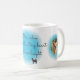 Two custom photos and your dog's name come together in this pastel blue watercolor mug. A subtle breed silhouette accents the verse: 'Blue calm surrounds a tiny heart that shines bright', creating a peaceful gift for pet parents.