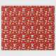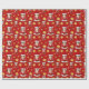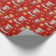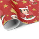 Christmas wrapping paper with an illustration of a cute smiling happy girl with long brown hair, she is wearing red and white Santa Claus costume and holding a present; Christmas holidays design with a seamless red background with stars
