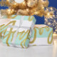Gold Joy is the greeting in a modern font is on the front of this mint green and gold stripe design.
