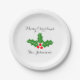 Custom Christmas party plates for the Holidays. Elegant calligraphy typography template with green holly leaves and red berries. Stylish design for dinner parties and more. Available in small and big extra large size. Add your own personalised greetings, wishes and name or family surname. Cute xmas home decor, decorations and supplies for the Holiday season.