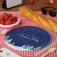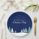 Beautiful midnight blue sky with Christmas fir trees decorate this pretty, custom Christmas party paper plate for a family dinner. Snow lines the lovely forest and white snowflakes sprinkle down in the night air. Personalise this pretty decor for a holiday gathering.