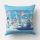 Custom Christmas winter wonderland snowmen cushion. Skiing, sledging and skating snow people in a winter wonderland setting.