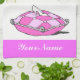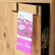 A custom towel with white script letters on pink and Cinderella's glass slipper on a pillow in light and dark princess pink, antique art restored from a vintage drawing for a storybook.