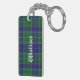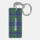 Stylish key chain done in the blue and green Wallace clan Scottish tartan plaid pattern. Bold white old world style text, on the front and back, is ready to personalise for yourself or as a great gift idea.