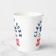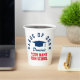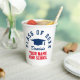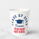 Custom class of 2025 high school graduation party Paper Cups. Personalise with your own name. Double sided print with tassel cap logo. Disposable party supplies for graduate celebrations. Customisable blue and red colours.