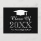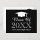 Custom class of high school graduation party postcards. Create your own invites or celebration card with cusstom year and name. Elegant black and white tassel hat design with stylish script typography template. Add your own year like etc.