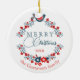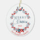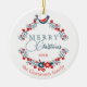This charming December Christmas holiday tree ornament showcases a stylish design showcasing a beautiful classic Scandinavian Christmas floral wreath with a peace dove and a traditional Christmas greeting. Additionally, it offers space for customisation or personalisation for your own text and family name. It is an elegant seasonal greeting that friends and family members will undoubtedly cherish.