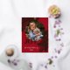 Contemporary classic Christmas holiday season greeting card with green coloured pine tree needles wreath leaves pattern on a classy dark red background, with real gold foil JOY wish text. With option and room to customise the text, family name and year date, and add a personal photo of your choice on the front, and a customisable season greeting message on the backside of the card.