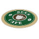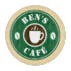 Custom coffee shop business name logo round glass Cutting Board. Round coffee bean and cup sign design. Personalize with company, employee name, barista name or cafe / bar company name. Green and brown colors. Trendy home decor for coffee shop, kitchen etc.