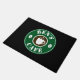 Custom coffee shop doormat with bean logo and cup. Modern black entry rug with personalised name of cafe or bar. Welcome your guests at the door. Also fun for home, office, business, brew house, roast company.