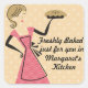 Updated retro pie girl with polka dot dress and apron, carrying a fresh pie on t-shirts, stickers, recipe postcards and more.