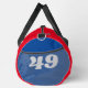 Custom colour jersey number sports team duffle bags. Great for gym, fitness, workout, work and sports like football, hockey, soccer, volleyball, lacross, handball, basketball, baseball, softball and others. Personalise with your own name. Blue and red 49 example.