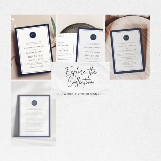 Customise these simple and elegant monogram wedding invitations to match your colours! Simply add your event details using the template fields provided, then click "customise it" to change colours. Shown in classic, crisp navy blue and white. An elegant double border and circular monogram badge at the top show off your colours beautifully, while the block and script lettering in dark grey showcases your wedding details in timeless style.