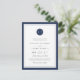Customise these simple and elegant monogram wedding save the date postcards to match your colours! Simply add your event details using the template fields provided, then click "customise it" to change colours. Shown in classic, crisp navy blue and white. An elegant double border and circular monogram badge at the top show off your colours beautifully, while the block and script lettering in dark grey showcases your wedding details in timeless style.