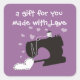 Black and white sewing machine and thread stitching a heart on this "handmade with love" gift tag sticker, product or packaging label for seamstress or sewing crafts. CHANGE THE COLOR of the background in the customise section, then under edit, then background.