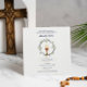 Celebrate a sacred milestone with this customisable First Communion invitation. A delicate wreath of leaves and branches surrounds bread and chalice symbols, with matching botanical branches on the back for a polished, elegant finish.
