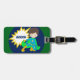 A boy in a cool blue and green superhero costume and cape next to a yellow action bubble personalised with your child's name. A cute custom action hero luggage tag for childrens travel.